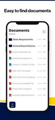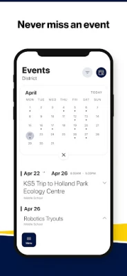 NEVER MISS AN EVENT The event section shows a list of events throughout the district. Users can add an event to their calendar and share the event with friends and family with one tap.