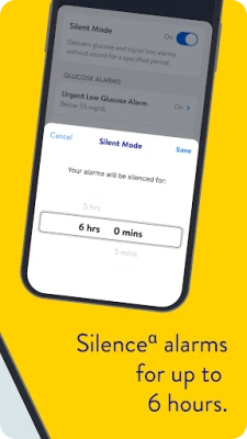 α. Silent mode silences signal loss, glucose, and urgent low glucose alarms, for up to 6 hours. You won’t hear these alarms, even with Override Do Not Disturb on, but visual and vibratory notifications may still appear per phone settings.