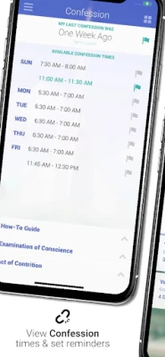 • Confession – Next Confession reminder, available Confession times, how-to guide, examination of conscience, and act of contrition.