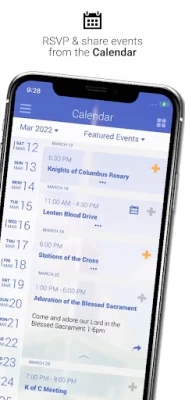 • Calendar – View or share time and location of upcoming parish events and RSVP when relevant or add to your phone's calendar.